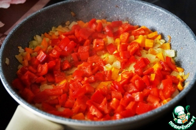 Обжариваем овощи на сливочном масле в таком порядке: лук и чеснок, затем - морковь, красный перец.
