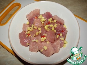 Мясо свинины нарезать не большими и не толстыми кусочками. Не большую часть имбиря порезать кубиками, чуть острого перца мелко нарезать, перемешать с мясом, добавить соевого соуса и щепотку сахара ( соль, если потребуется), я немного солю мясо, т. к соевый соус очень слабосоленый. Замариновать и дать постоять минут 20