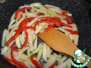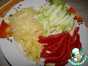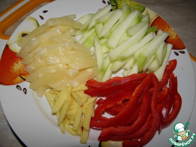 Займемся соусом. Нарежем сладкий перец, имбирь, ананас и цукини.. ( можно средней соломкой, можно ломтиками..)