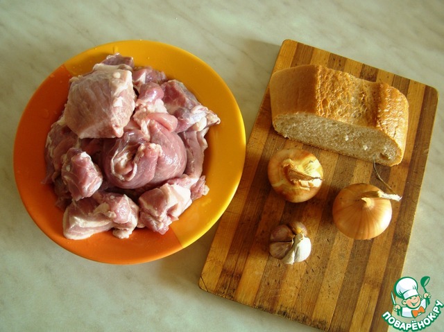 Подготовим ингредиенты для фарша: мякоть свинины, лук, чеснок и ломтик хлеба.