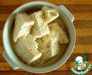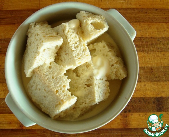 Обрежем корку с хлеба и мякиш зальём сливками, оставим намокать.