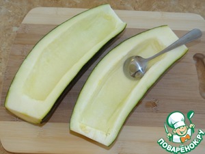 Кабачок разрезать вдоль пополам, из каждой части вынуть сердцевину, формируя лодочки;