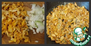 За это время мы режем мелко лук и грибы, у меня лисички. Обжарить на масле до готовности.