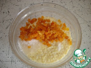К хлопьям добавить нарезанную курагу, сахар, щепотку соли. Перемешать.