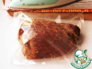 Запаянный пакет с мясом я уложил в холодильник, в самое холодное место (желательно, чтобы температура не превышала 6 град Ц). Засол продолжался 5 дней. Два раза в день я доставал пакет с мясом и слегка массировал его. Это способствует равномерному и качественному засолу. Солить можно и дольше 5 дней - до трёх недель. Это только улучшит вкус готового изделия. Но всё же, если вы использовали только поваренную соль, без нитритной, - лучше дольше недели не солить (во избежание ботулизма).