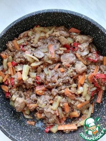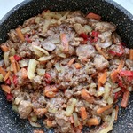 В ту же сковороду добавляем болгарский перец и морковку. Жарим еще 3 минуты, периодически аккуратно помешивая.