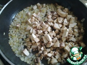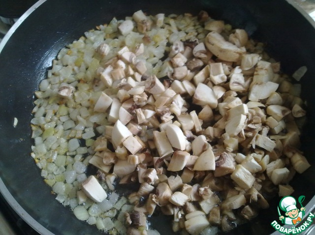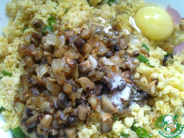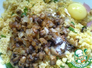 В заваренные пшенные хлопья добавить жаренные грибы с луком, посолить и поперчить по вкусу. Вбить яйца и все хорошо перемешать.