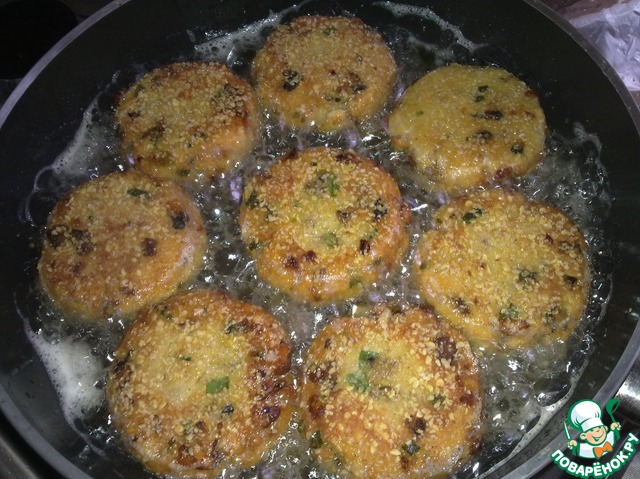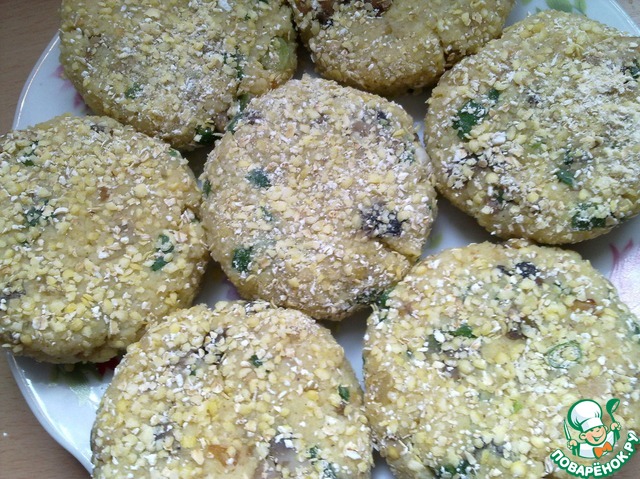 Из приготовленного пшенно - грибного фарша сформировать котлетки, обвалять их в панировке из хлопьев.