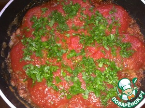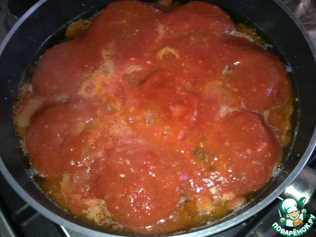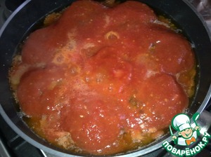 Котлеты залить томатом и тушить под крышкой до готовности.