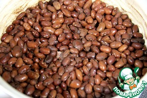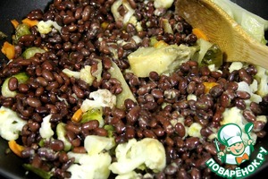 Добавить отваренную фасоль, соус, соль и перец. Перемешать и тушить еще около 2-3 минут.