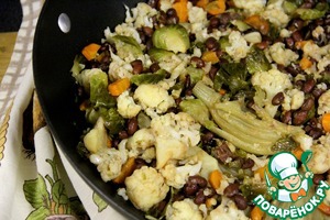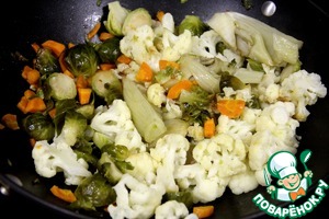 Цветную капусту разобрать на соцветия, брюссельскую капусту порезать на половинки, морковь кубиками, а фенхель на четверти.