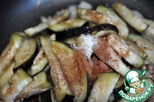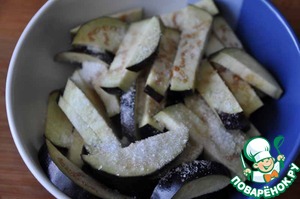Баклажаны промываем под проточной водой, отжимаем, кладём на сковороду, добавляем сахар, корицу и какао. Перемешиваем, тушим 5 минут.