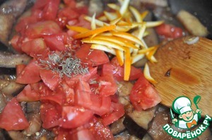 Кладём тимьян, кориандр, мелко нарезанные помидоры, цедру, апельсиновый и лимонный сок.