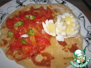 Посолить-поперчить и можно подавать. К чему? Да к чему угодно. Просто съесть его с питой или лепешкой. Но я готовлю малауах - то ли это слоеный блинчик, то ли жареная на сковородке лепешка.