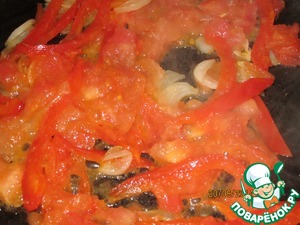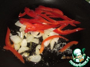 Для начала на сковороде в растительном масле слегка поджарить перья репчатого лука и 1-2 дольки чеснока, добавить к луку полоски сладкого перца.