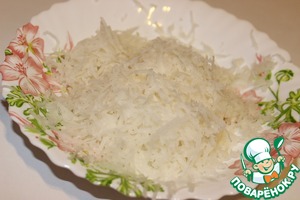Редьку моем, чистим и натираем на мелкой терке. Солим и даем ей постоять 20 минут, затем образовавшийся сок нужно слить.