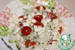 Петрушку измельчаем, помидоры нарезаем дольками или пополам. Добавляем к редьке.