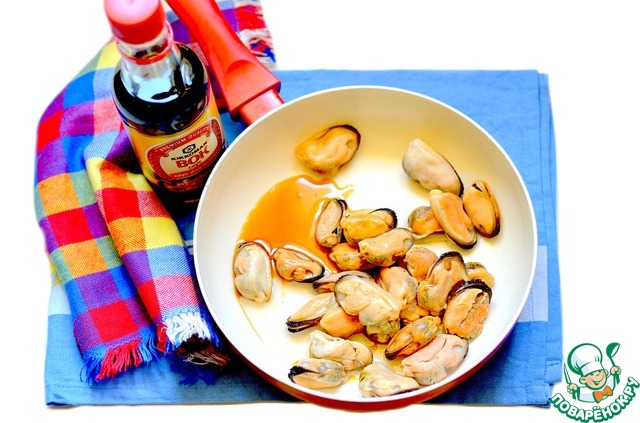 Мидии обжарить в растительном масле с добавлением соевого соуса.