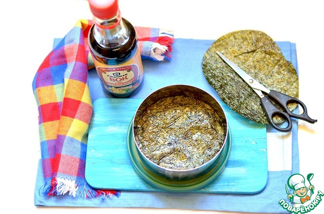 Нори вырезать по диаметру формы. Выложить на имбирь.