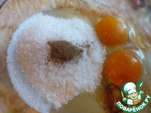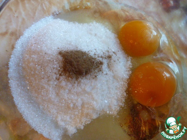 В жаропрочную кастрюлю вбиваем 2 яйца, насыпаем сахар, ванильный сахар и корицу.