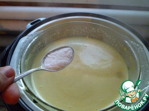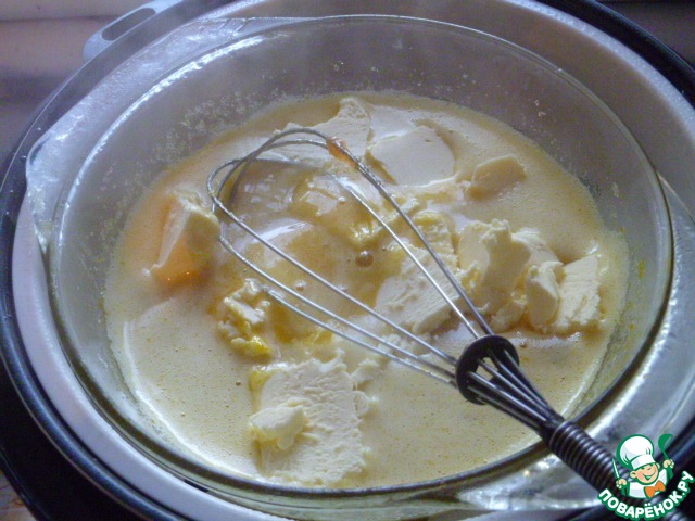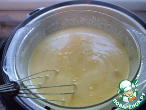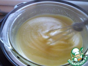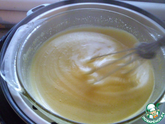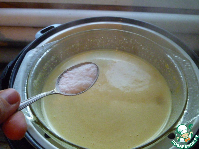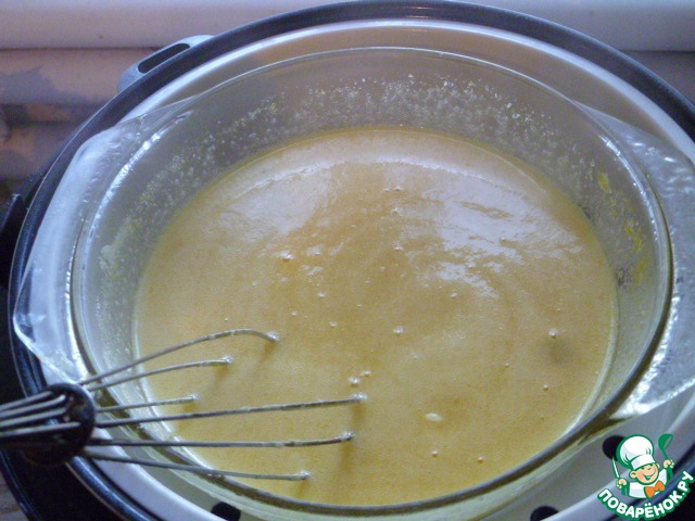 Когда мультиварка начала отсчет времени и пошел пар, ставим чашу для пароварки и на нее ставим нашу жаропрочную кастрюльку с тестом.