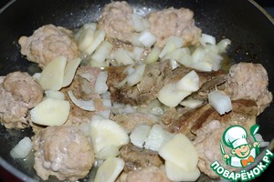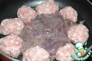 Свиной фарш посолить и слепить шарики. Печень порезать на небольшие кусочки. Разогреть на сковороде подсолнечное масло. Шарики из фарша и печень выложить на сковороду и поджарить в течении нескольких минут.