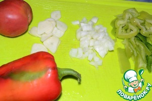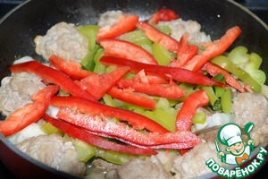 Перец зеленый и красный нарезать соломкой, добавить в сковороду.