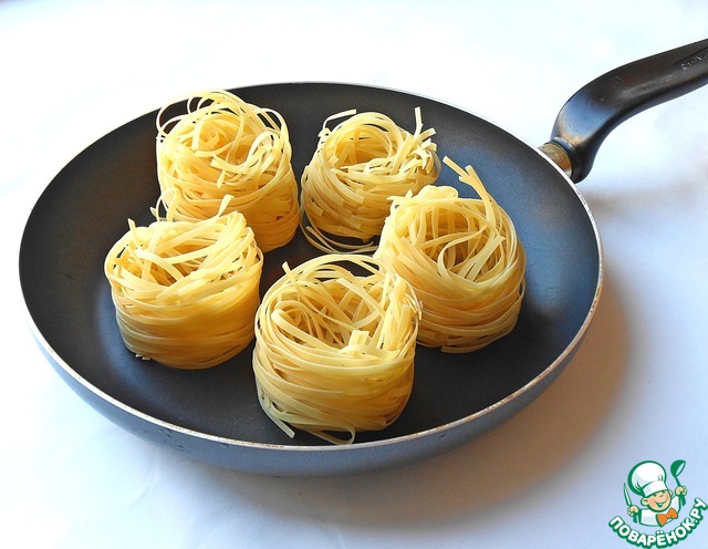 «Гнезда» выложить в сковороду (сотейник). Лучше брать такое количество, чтобы они лежали плотнее друг к другу.