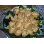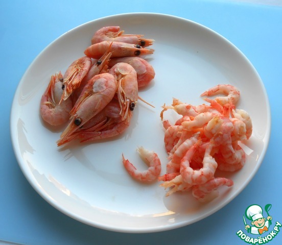 У меня были варено-мороженые креветки, я их разморозила и почистила. Вес очищенных креветок 100г.