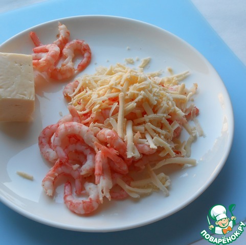 Сыр натереть на терке, смешать с креветками и выложить в «гнезда».
