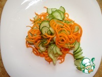 Морковь и огурец порезать тонкой спиралью или тонкой соломкой, уложить на тарелку, перемешать; |