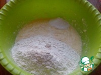 Затем ввести смешанную с разрыхлителем муку и замесить мягкое песочное тесто. |