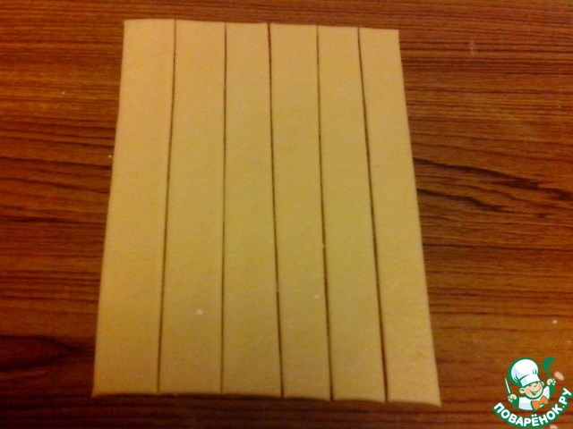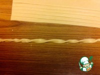 Оставшиеся обрезки теста собираем в комочек, раскатываем еще один пласт и разрезаем на узкие полоски. Полоску теста скручиваем спиралью |