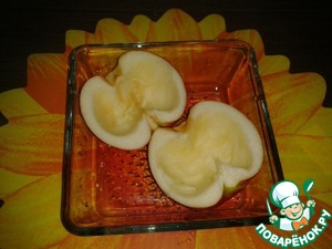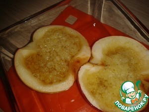 Насыпаем в каждую половинку пшенные хлопья, почти полностью заполняя. Наливаем в каждую половинку по 1-2 ст л. воды. Сверху поливаем мёдом. Если мёд густой, просто положить ложку мёда сверху, он в духовке растает.