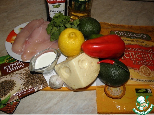 Подготовить соус: Авокадо очистить, удалить косточку и нарезать небольшими кусками. добавить чуть жгучего порошкового перца., добавить натертый чеснок, оливковое масло, зиру, орегано, сливки и немного лимонного сока, кинзу ( соус должен получится консистенции пюре ), солить по вкусу. ( Самое сложное в этом соусе, это выбрать спелый авокадо..!)