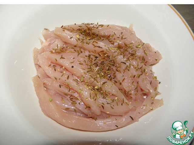 Куриное филе нарезать тонкими долевыми полосками. Посолить, добавить растительное масло Идеал, и добавить специи ( Зира и Орегано). Все перемешать и оставить на 20-30 минут