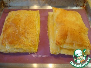 Нагреть духовку до 210градусов. Выпекать коржи теста (у меня два коржа) в течение 13 минут.