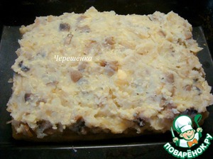 Добавить картофельное пюре и 50г сыра, перемешать.