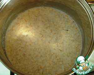 В небольшом сотейнике доводим до кипения молоко и воду. Отправляем туда овсяные хлопья. Перемешиваем.