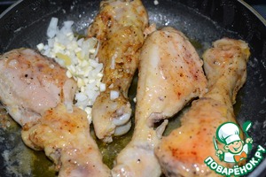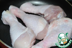 Куриные голени вымыть, обсушить полотенцем, обтереть солью. В сковороду с растительным маслом выложить голени и обжарить несколько минут.