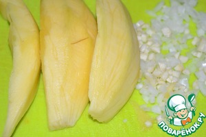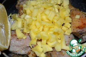 Мякоть манго рубим ножом, выкладываем к голеням. Добавляем лимонный сок.