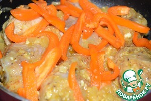 Сладкий перец нарезаем соломкой, выкладываем в сковороду, тушим еще 2 минуты. Добавляем базилик и зиру.