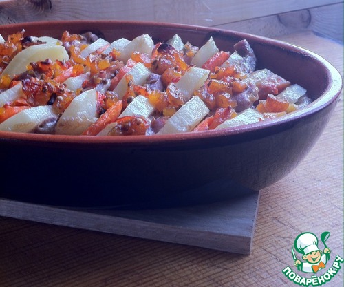 Запекаем до готовности мяса и мягкости овощей. У меня ушло 45 минут, через 30 минут фольгу я убрала.