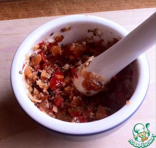 В ступке смешать мелко нарезанные чеснок, чили и курагу с имбирем, кориандром, солью и 1 ст. л. подсолнечного масла.