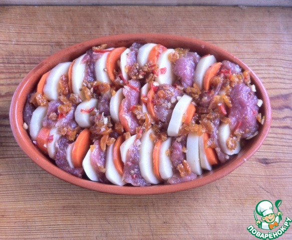 Выложить в жаропрочную форму, смазанную подсолнечным маслом, мясо, картофель и морковь. Сбрызнуть подсолнечным маслом и вином. Накрыть фольгой и поставить в духовку, разогретую до 180 градусов.