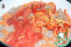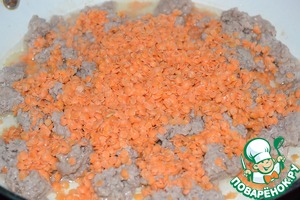 В сковороду к фаршу добавить чечевицу. Обжарить в течении 3 минут.