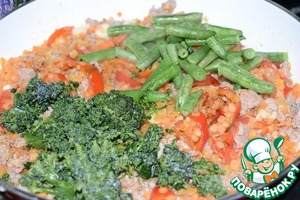 Добавляем фасоль стручковую, брокколи и хмели-сунели на 4 минуты. Выключаем огонь, пусть блюдо немного постоит, насытится овощными нотками.
