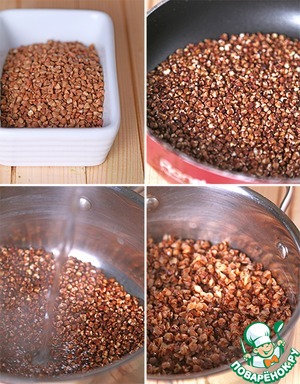 Для начала нам нужно приготовить гречку. Для этого прокаливаем крупу, помешивая, на среднем огне около 5 минут - она будет забавно шевелиться и вести себя примерно как попкорн, разве что не выпрыгивать))