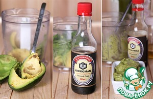 Для этого очистим авокадо - я делала это с помощью ложки - переложим в блендер, добавим два вида масла, столовую ложку соевого соуса, рукколу и немного лимонного сока (чтобы добавить пикантности и, главное, чтобы крем потом не сразу поменял цвет), и превратим все это в пюре. Готовый крем убираем в холодильник. -