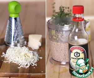 В блендер засыпаем сварившуюся гречку, добавляем яйца, тертый сыр, тимьян или другие травы по Вашему вкусу, столовую ложку соевого соуса - пюрируем. Далее наливаем сливки, сколько возьмет для средней жидкости теста. У меня ушло около 100мл. -